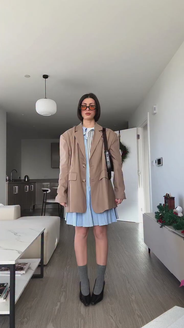 A crisp study in contrast, the Sweet Striper Dress features a slim-fit shirt silhouette on top that falls into a precision-cut pleated skirt. Blue and white color-blocking adds an effortless sharpness.